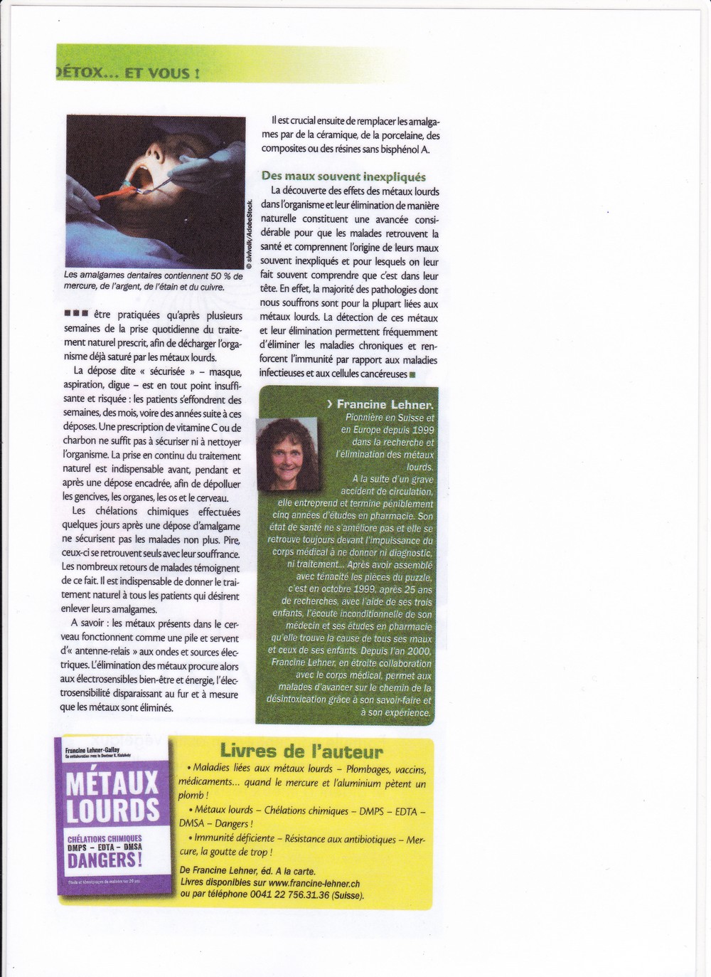 ... A cette époque, aucun traitement spécifique n'existe. Dès lors, Francine Lehner-Gallay se met à pister chaque élément responsable de son état de santé afin de les exclure de sa vie. C'est un combat contre la nocivité des médicaments, des vaccins, de l'alimentation et de l'environnement qu'elle raconte dans son livre Maladies liées aux métaux lourds, qui vient de paraître dans sa 4e édition. Une étonnante analyse sur la cargaison de saletés nocives que nous absorbons au quotidien, en 480 pages..."